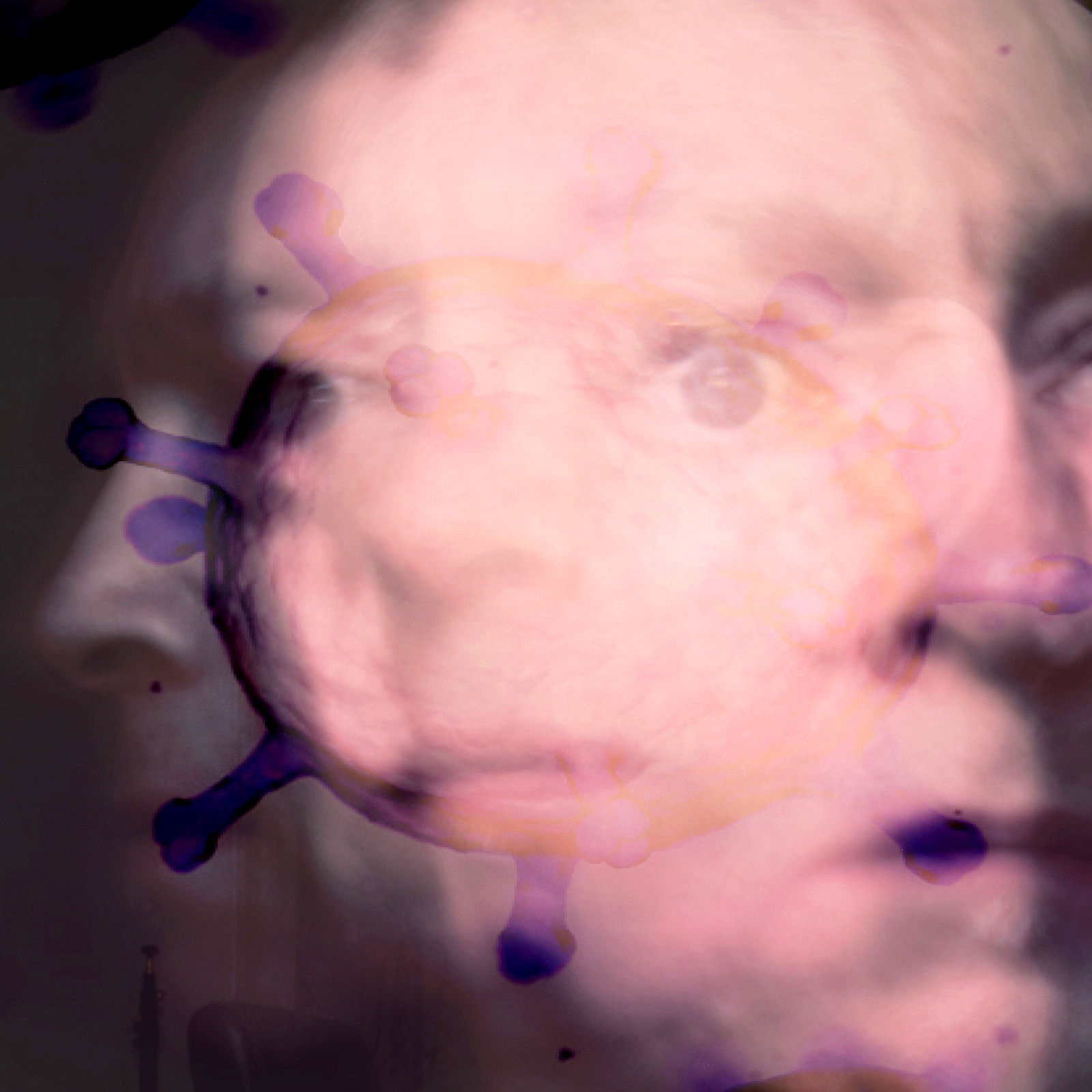 Die Corona-Krise, ich nenne es hier mal so, verlangt gleichsam nach einer künstlerischen Reaktion. Diese sollte Gefahr und existenzielle Bedrohung, aber auch den Protest gegen das ‚wilde Wüten der Natur‘ beinhalten. Da in solchen Zeiten die „Sorge um sich“ (wie Michel Foucault sie eindrucksvoll untersuchte – Band 3 von Sexualität und Wahrheit) einen großen Stellenwert einnimmt, habe ich meinen künstlerischen Protest auf einem Selbstbildnis aufgebaut – jenem multiplen Portrait mit dem Namen „Wir“, das ich bereits im letzten Jahr hier vorgestellt hatte. Die Bedrohungsperspektive liefern recycelte Virusdarstellungen aus dem Netz. Den Rest hat mein getreuer Rechner erledigt, der sich, so nehme ich jedenfalls an, auch vor Viren fürchtet … allerdings nicht vor diesem speziellen. Jeder hat seinen eigenen Angstgegner.