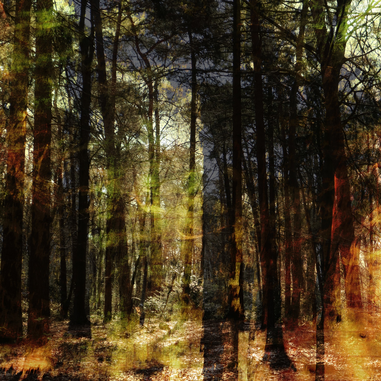 Jetzt habe ich mehr gesehen. In den letzten Wochen war ich viel in den (nicht nur verglichen mit dem Schwarzwald) winzigen Wäldchen unterwegs, die überall um und sogar mitten in Hude anzutreffen sind. Die meisten von ihnen offenbar namenlos – oder man hat mir noch nicht verraten, wie sie hier jeweils genannt werden. Ich konnte einige Impressionen mit der Kamera festhalten, die dann (wie es so meine Art ist) jeweils noch digital aufgehübscht wurden. Aus größeren oder kleineren Baumgruppen, die für sich allein genommen nicht sehr spektakulär wirken, wurden auf diesem Wege surreale Kompositionen, die jeweils meinen sehr spezifischen Blick auf die ortsnahe Landschaft wiedergeben. Von der Stimmung her manchmal vielleicht sogar ein wenig unheimlich. Auch wenn es auf den ersten Blick um das Thema Wald geht, handelt es sich doch um eine klassische Kulturlandschaft: künstlich angelegte Zwergwälder (ohne Zwerge allerdings), um den Ort zu verschönen oder vielleicht kleine Erholungsflächen in die ohnehin sehr weitläufige Siedlung einzustreuen. Aus der Luft betrachtet, ergibt dies alles eine Art Streuselkuchenoptik: Hundert Häuser hier, hundert Bäume dort. Die größeren, naturnaheren Waldflächen, die es hier in der Gegend auch geben soll, habe ich bislang noch nicht erkundet. Und die angeblich vorhandenen Moore auch noch nicht. So ist noch genug zu entdecken. Vorerst bleibt dies mein neues Sujet: Kulturnahe Naturflächen (wenn man in Zusammenhang mit Nutzwäldern von Natur sprechen mag). Man möge mir nachsehen, wenn ich diese bewaldeten (oder verwaldeten?) Huder Impressionen einfach nur durchnummeriert habe. Zu Bildern dieser Art fallen mir meist keine aussagekräftigen Titel ein.